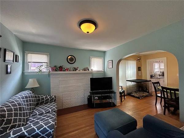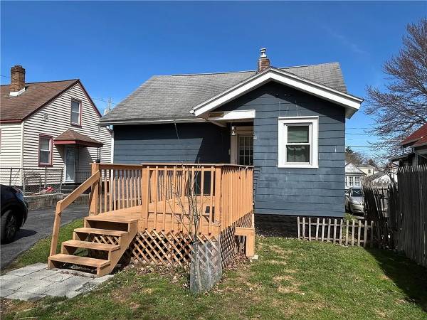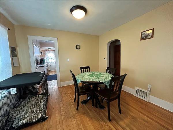 Bright 2-bedroom, 1-bath home in Syracuse with about 799 sq ft. The living room has natural light and hardwood floors, with archways leading to a formal dining space. Kitchen includes appliances for daily use. The basement is large, dry, and handy for storage. Step out back to a small deck for fresh air. Central air keeps things comfortable year-round.