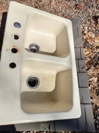 Vintage 1990s Kohler cast iron kitchen sink with attachment for insinkerator and standard drain thread. There are no cracks on the porcelain enamel, it’s in excellent condition. Cool retro look for home kitchen or camp. Made in USA. Almond color. 22” x 33”. $30