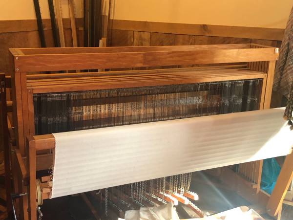 Tools of the Trade 60” weaving width, 8 shafts, 10 treadles, vintage (70’s???) maple loom with 5 reeds and bench. I’ve been weaving on this until last week and the shafts operate smoothly. Friction brake. Lease sticks. Handmade padded bench with storage. Reeds-6,8,10,12,16 (one reed is 54” but the rest are 60”). Folds up. Chains and pins for all shafts. Says 1800 inserted eye heddles but I did not count. Clean canvas aprons.