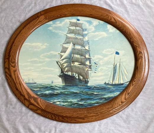 Vintage Large Art Print of Clipper in Oval Solid Oak Wood Frame 30" x 36" GREAT CONDITION