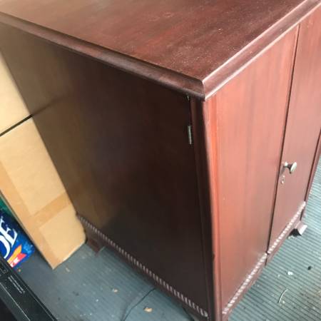 Antique record cabinet converted to hold separate components. 33 1/2” high x 20” wide x 22 1/2” deep. Components not included. Phone number is three 1 five 6 seven 6 two 5 four 8. If ads up it’s...