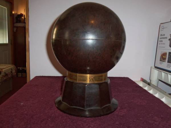12" tall, 7 1/2" deep, 6 colorful shot glasses, decanter 9" tall. Plays "Anchors Away". from the 1940's or 1950's. Vintage Evans Bakelite Musical Bowling Ball.