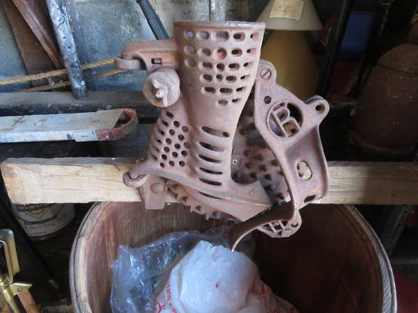 Antique cast iron corn chopper on board for sale, $100. This is a unique item dating back to the turn of the century, around 1904. Manufactured by the Root Heath Company (R & H) in Plymouth Ohio. It is stamped with both the R&H logo on the top and Root Heath on sheller wheel and is in very good condition. It is designed to mount on a board, as is, and secured over a barrel to catch the shelled corn. The cob is ejected from the sheller to the outside of the barrel when turning the handle. It was rated at 14 to 16 bushels per hour and is still completely functional when handled with care. See my other ads. Call show contact info