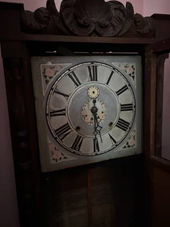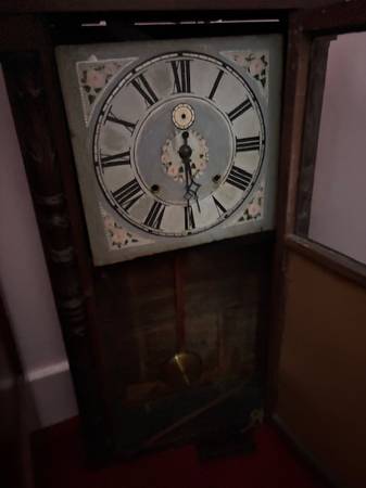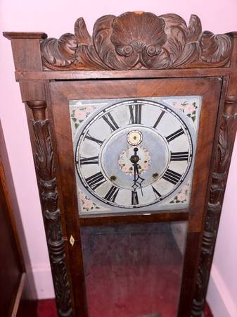 Antique artisan colonial clock for sale, asking $100. This clock dates back to the early 1800’s or older, requires some research. It has a hand painted face, two large hands and a smaller second hand. It is decorated along the sides and pediment with hand carved columns and floral pieces. The bottom door has the original silver tinted mirror. The pendulum and keys for winding and setting the clock are included. It is missing the cable and weights that would operate the clock, but otherwise it is in nice period condition. Selling at a bargain price.