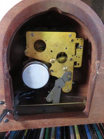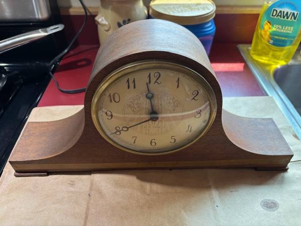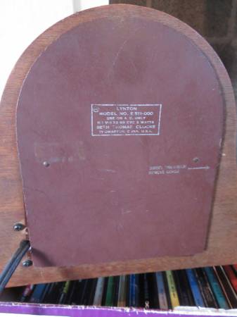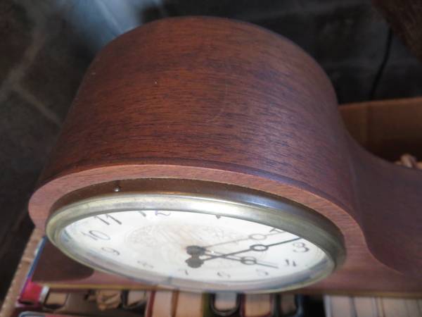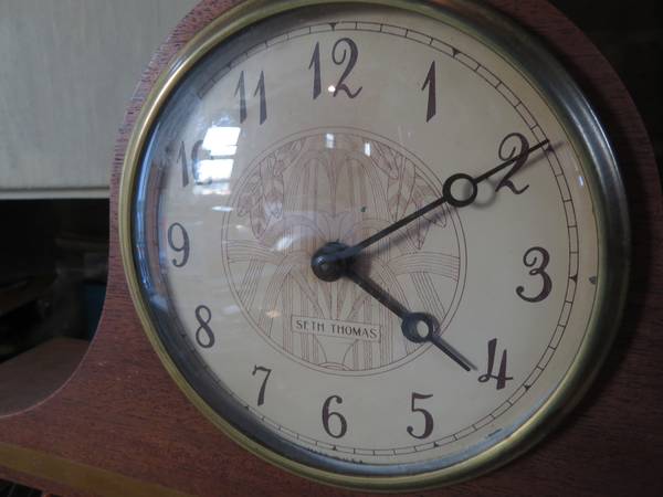 Also available, an antique electric Seth Thomas chime mantle clock Model E511-000 in excellent working condition, asking $50. It was made in Thomaston, Connecticut in the 1930’s, so is approximately 100 years old. It keeps perfect time. It chimes on the half hour and strikes the dong on the hour for the corresponding number of hours. It has decorative wood design cherry finish, handsome face, glass and hands very nice.