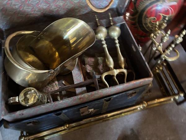 Antique hand forged large heavy wrought iron andirons with front fender, $250 firm. This is a one-of-a-kind ornate set intended for a larger fireplace, dated late 1800’s. The andirons are in excellent original condition, showing no wear. The gothic design and swirls are consistent and matching on each piece. Height is approximately 28” with stays approximately 20” deep. The front width is adjustable depending on fireplace opening. Great for any large indoor or outdoor use. Also available, brass fireplace fender, andirons and miscellaneous pieces, asking $40 O.B. See my other ads. Call show contact info