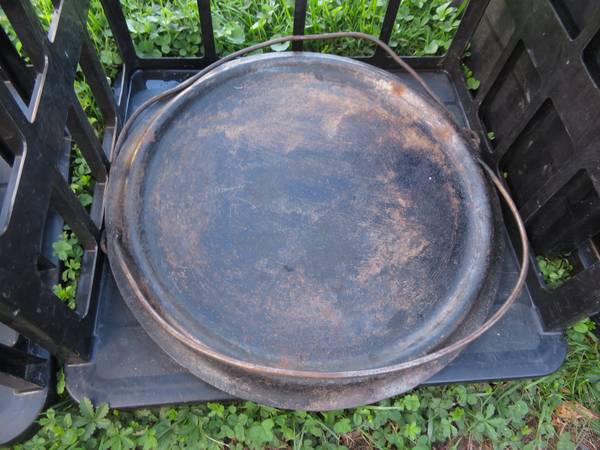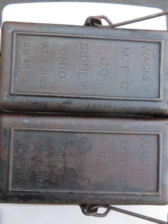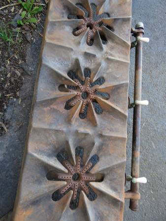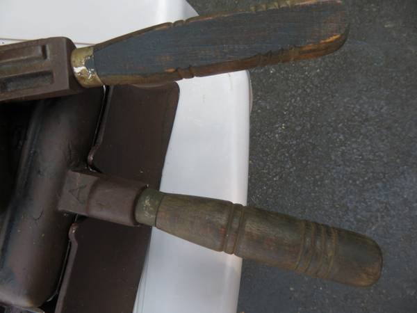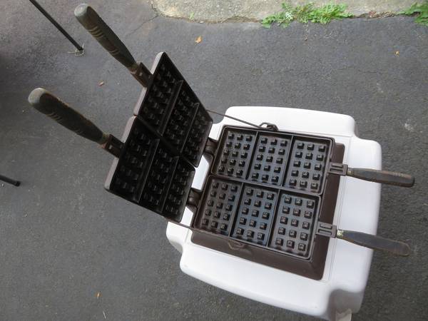 Rare Antique Wagner 1892 double waffle maker for sale, asking $400. This is a fully functional antique waffle maker suitable for wood stove top, gas or electric stove. It is in excellent condition. Compare with 1909 Wagner’s that are not nearly as nice. This has wooden handles at each section and a twisted metal grip swing handle for lifting. Each side of waffle maker swivels at the raised 10” base. Also available, an antique Griswold #638 three burner gas grill. Grill is fully functional and complete except for one small clip at one burner, which could easily be fabricated. Each burner has its own shut-off valve. This grill would make a nice addition to your deck or patio, also great for production of maple syrup. Asking $100, O.B. for gas grill. A few gridles and cast-iron pans also available. See my other ads. Call show contact info