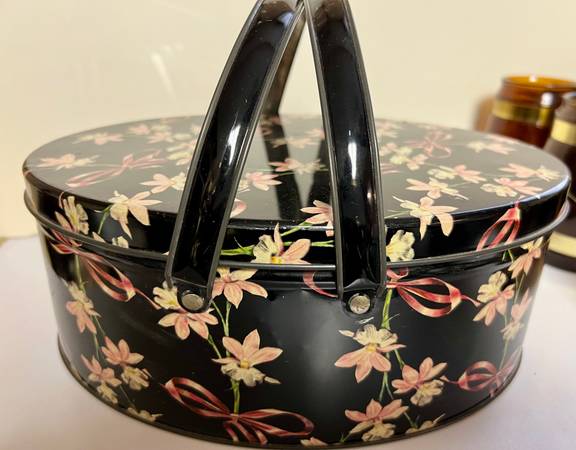 This box measures approximately 11" long, 8 1/2" wide, 4 1/4" high. I believe it's from the 1940's-50's. This box at one time held cookies. It now would make an excellent sewing box. There isn't any major damage or rust, but it does show minor age. Price is $5 cash please. We are located in the Liverpool / Clay area for pickup. If interested or to ask a question just email me back. Be sure to check my other items up for sale. Thank you.
