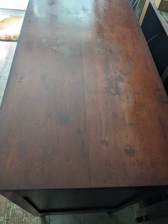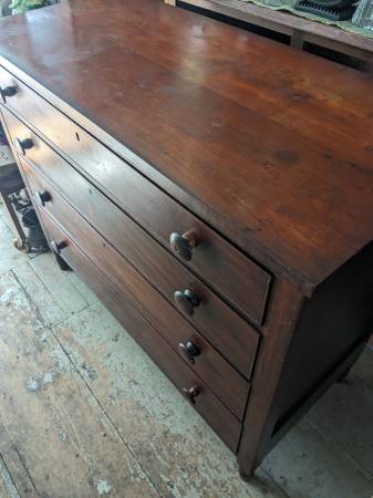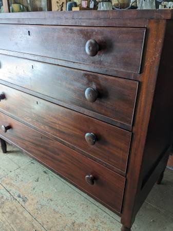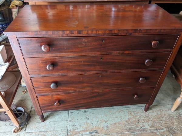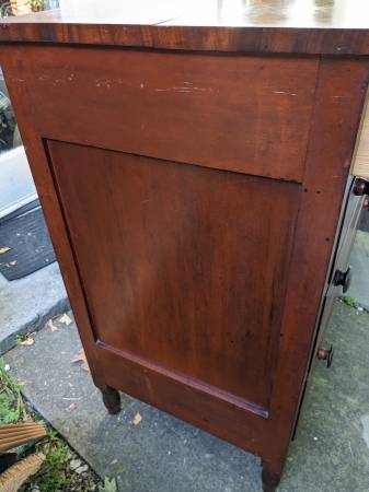 It is entirely made of Cherry wood including the back boards. The hand dovetailed drawers have nicely figured fronts that are trimmed with cockbeading. The top and the drawer spacers are edged with mahogany veneer.