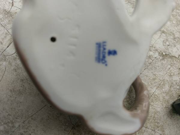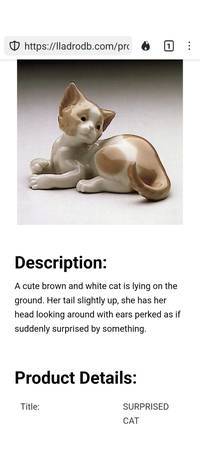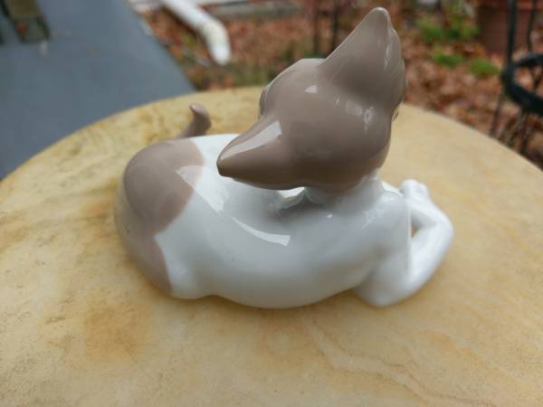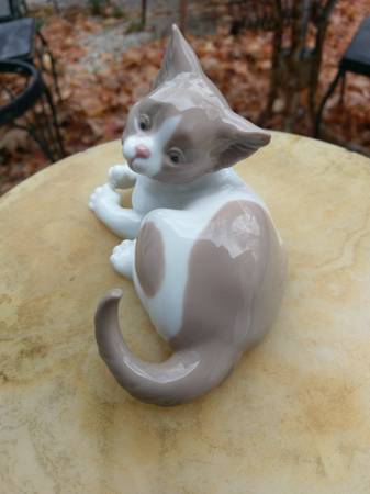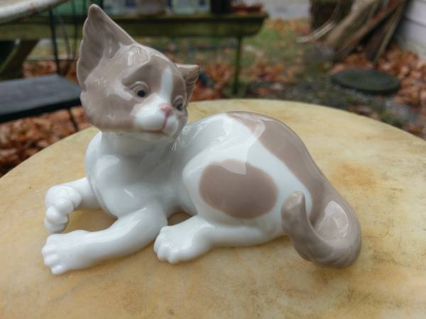 A Lladro "Surprised Cat" porcelain figurine hand made in Spain in 1982. It measures 5" long and is in mint condition. Call 315-637-Seventeen Fortynine.