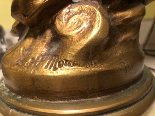 Selling a signed L & F Moreau antique table lamp for $250. Measures 40 inches tall and the shade is 14 inches in diameter. It is of a man in gold pants, white shirt, canteen and holding a hay...