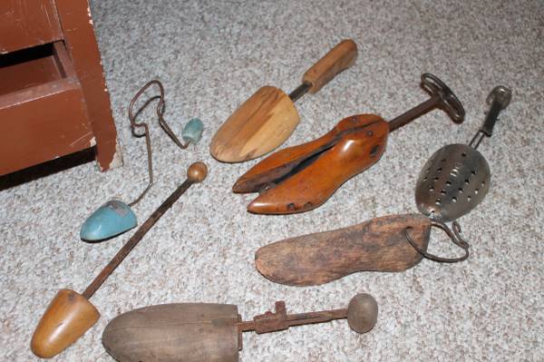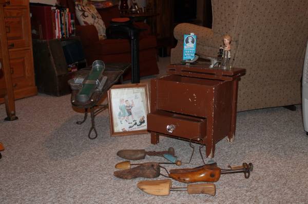 Vintage shoe store display and Equipment including a bannock,cast iron anvil shoe shine box ,metal shoe strechers,wooden shoe strechers,1940's pair also ,soe stool vintage sani-whitepolish bottle and box. Buster brown advertising. If interested e-mail me back with your Tel # and I will get right back to you. $200 or b/o
