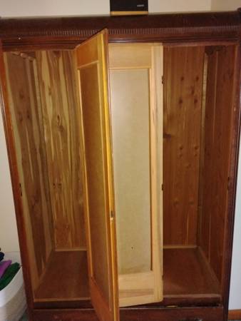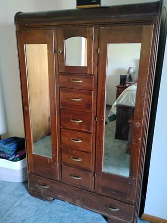 We've owned this since 1984; it was left behind in a Sears Catalog house we bought back then and may have some antique value. The closet sections are cedar-lined, all drawers slide fine, and the three doors swing true. There are some small scratches here and there.