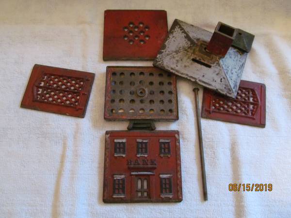 Turn of the century antique metal bank in the shape of a building, painted red. Appraised at $200-$300. NO REASONABLE OFFER REFUSED.