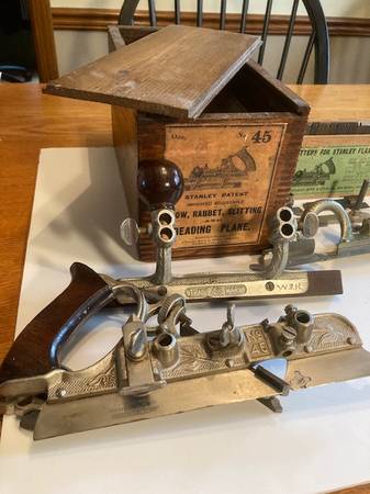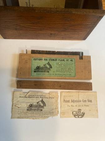 Antique Stanley No. 45 Combination Plane Very good condition Rare chestnut dovetailed box All parts shown are included Great addition to any tool collection $295 calls or emails only (no text)
