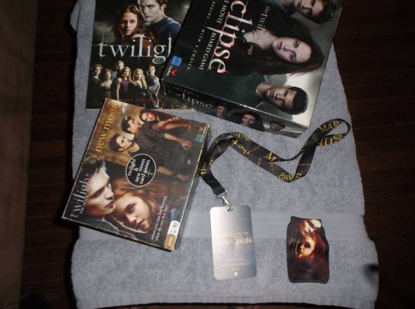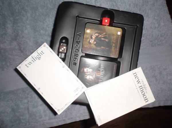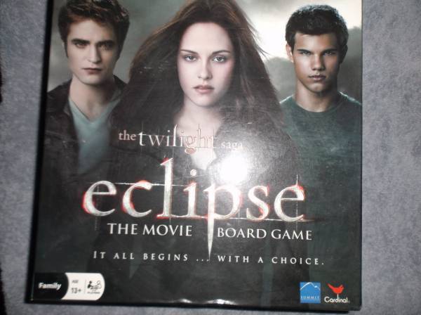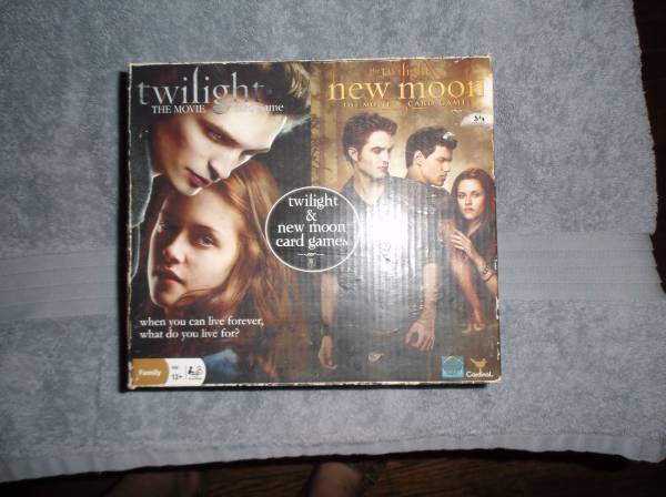I have for sale one twilight and new Moon Combo (2 card Games In One Box) game, used a few times, the box is a little worn, a Twilight Eclipse Game in Mint Condition, I don't Know whether it was ever played, A Movie Companion Picture Book in excellent Condition, a Twilight Marathon Lanyard, and A Twilight water Bottle Wrap. Please bring exact change. Thank You for looking and please look at the other items I have for sale. ATTENTION! Half off on December 23rd and 24th only!!