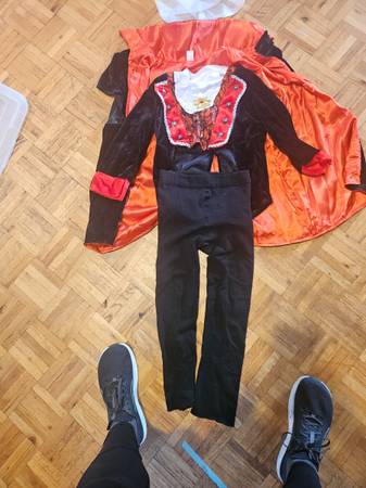Gently used vampire costume with fancy shirt and red velvet-like cloak. Should fit ages 4-7.