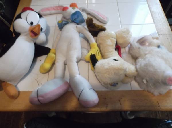 I have for sale 4 stuffed Characters they are used, so I did wash them, and I don't see any holes in them. they are in great shape there are a few small stains on them. But great for the kids to play with the Characters are as follows: Willie The Penguin, Odie from Garfield, Roger Rabbit and a Kitten. Thanks for looking By The way I also have a Garfield for sale, check out the other items I have for sale and please bring exact change! ATTENTION! Half off on December 23rd and 24th only!!