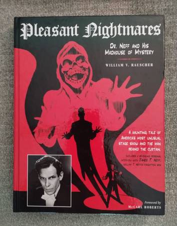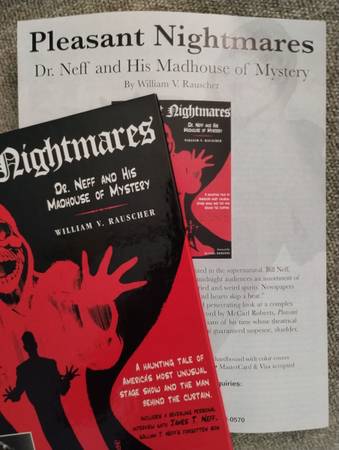Pleasant Nightmares Dr. Neff And His Madhouse of Mystery! Hard-to-find out of print book about the legendary mid-century late night theatrical spook shows / spirit / ghost mystery magic acts. 315 pages loaded with over 325 photographs & illustrations, with interviews, fascinating descriptions and research. Unlike any other copies I've seen, this one comes with the publicity sheet shown in the third photo.