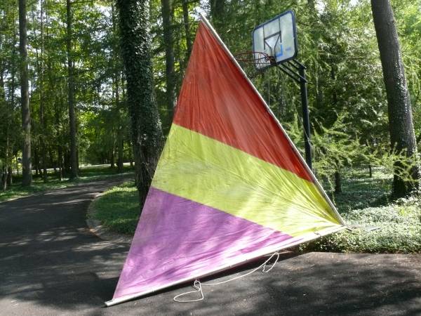 Colorful Minifish sail for sale. Is aftermarket, sailmaker unknown. No sail logo, but cloth is crisp and the aerodynamic shape is good. Has two small (dime size) holes in the bottom panel which I will repair with adhesive sail repair tape. Needs a good cleaning. $45 + postage