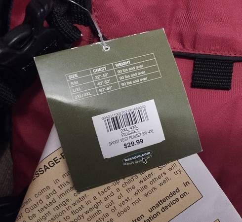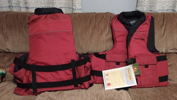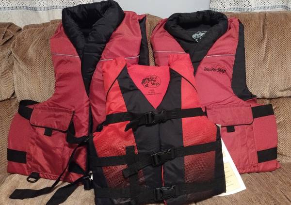 Three brand new lifejackets from BassPro along with two small extra used jackets. The 2 large BassPro jackets still have tags attached, the youth sized one does not. All three are new, unused. New...