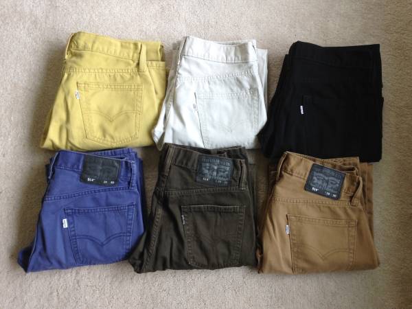 -- Levi 514 twills - size 29 waist x 30 length - colors: stone, black, violet, moss green, (yellow and khaki tan in photo have recently sold)
