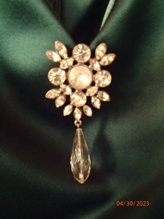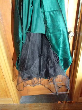 Beautiful strapless, floor length emerald green evening gown. Size 12. Simple but elegant, timeless and versatile fashion design. Perfect for prom, mother of the bride/groom, evening ballroom gala, New Years Eve, any function that is appropriate for a long gown. The material gives the dress a varied emerald to dark green hue depending on the lighting, even though it is one color. Netted underlay maintains the lines of the dress from the waist down. The centered crystal brooch enhances the look of the bodice. There is no sewn in bust support. Length is approximately 52" from top of zipper to bottom of dress. Worn once and cleaned. No stains, rips or catches in the material. The 'spot' in the 3rd pic halfway down the lower part is a glitch from the camera, (please examine the other pics of the back). The person modeling the dress is a smaller size therefore the dress is not fitted accurately on her. Price is firm. Downsizing, no returns, no deliveries, cash only.