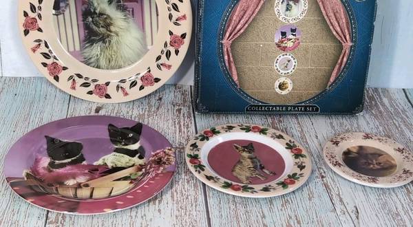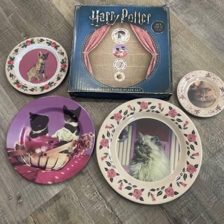 Harry Potter Collectable Plate Set, Professor Umbridge Cat Plates, set of four, acrylic - BRAND NEW in box. I only removed plates from box to take pictures