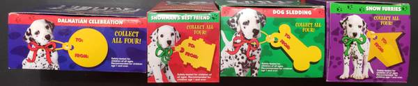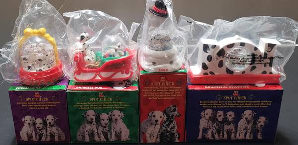 For Sale! Selling From My Own Collection Is McDonalds Vintage 1996 (Complete Set Of 4) Disney's 101 Dalmatians Snow Globes Collectibles. All NEW IN SEALED PACKAGE INSIDE BOXES. Each Box Includes: Dog Sledding, Snowman's Best Friend, Snow Furries and Dalmatian Celebration. These Would Be Great For Disney Fans And Dalmatian Collectors Etc. I have Never Taken Them Out Other Than To Take Them Out Of The Boxes To Take These Pics To List. Selling For $23 FIRM! Check Out The Other Items I Have Listed, Many Are Collectibles And New.