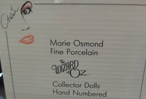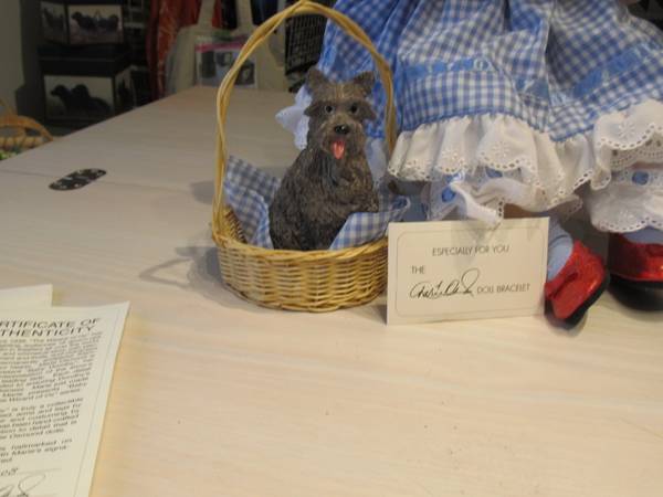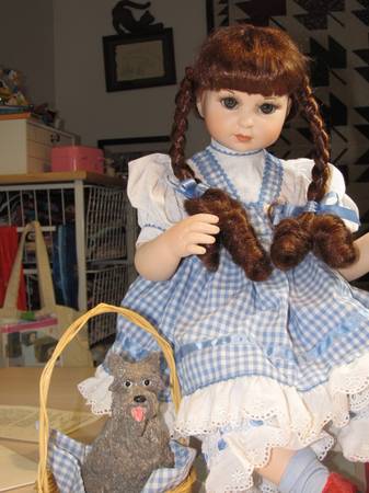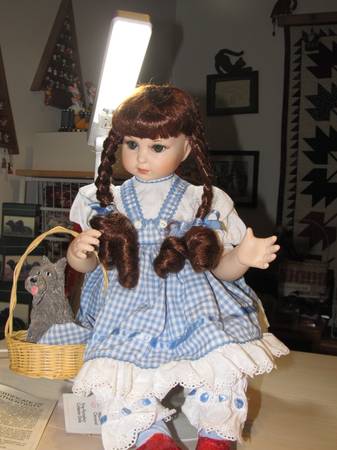 Porcelain hand numbered (1708) 16 inch toddler Dorothy doll from The Wizzard of Oz collection. Includes Toto figurine in basket. This has been kept in it's original box, which is not shown, but is included, and has only been taken out for the purpose of photographs. It is in like new condition, with certificate of authenticity