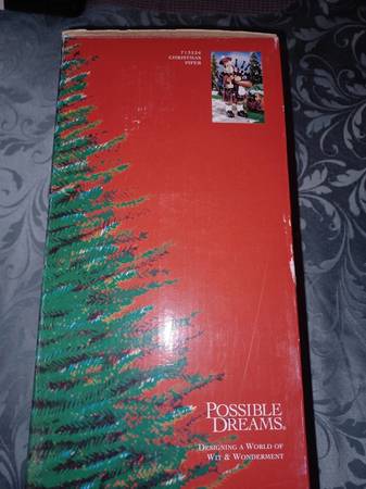 Clothtique Possible Dreams Scottish Santa figurine. It depicts Santa Claus in traditional Scottish attire, including a kilt, tam o' shanter, and playing bagpipes. The "Clothtique" technique involves...