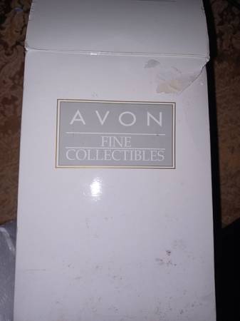 Avon Blue Jay Porcelain Bell, a collectible figurine produced in 2001. It features a blue jay with its wings spread, perched atop a white bell adorned with raised leaf patterns and pink flowers. It is a popular item among collectors and bird enthusiasts.