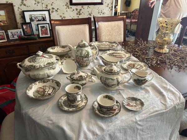 Beautiful 8 piece The Friendly Village china set. Includes coasters, 2 serving bowls, 2 platters, gravy boat, butter dish, coffee and tea containers, soup terrine, sugar bowl and creamer.