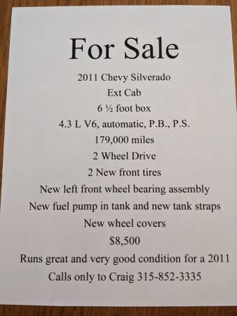 2011 Chevy Silverado for sale. Full details in picture. Calls only please to Craig - three one five eight five two three three three five