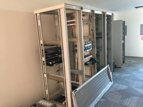 We have three used full size 7 foot Compaq server racks and one 6 and half foot Compaq server rack on wheels. The 6 1/2 foot rack is a full enclosure with a removable door. These are standard 19 inch wide racks. They are about 26 inches deep.