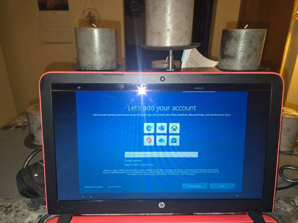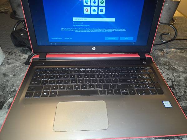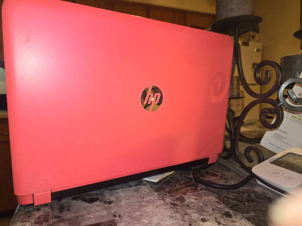 Hp 17 in laptop. Peachy Pink, runs windows 10, can be upgraded I believe. Touchscreen, back lite keyboard. Has been reset to factory settings. Just needs to be setup by new owner.
