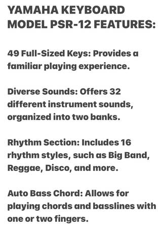 FOR SALE I HAVE A “YAMAHA” • PORTABLE KEYBOARD • MODEL PSR-12 • PRE-OWNED • IN VERY GOOD CONDITION. ALTHOUGH PRE-OWNED, THIS YAMAHA KEYBOARD IS IN VERY GOOD CONDITION, WORKING ABSOLUTELY 100%...