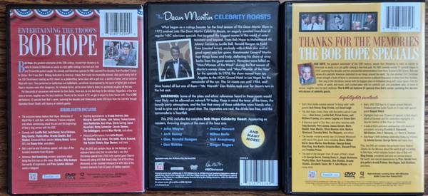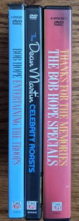 Selling My Mom's Time Life BOB HOPE DEAN MARTIN DVD SET. This Comes With A New Sealed (4) Disc ENTERTAINING THE TROOPS BOB HOPE COLLECTOR'S EDITION, The Dean Martin CELEBRITY ROASTS DVD Like New, and A (6) Disc THANKS FOR THE MEMORIES The BOB HOPE SPECIALS NEW NEVER VIEWED. All (11) Discs For $20 FIRM! Cash Only! All sales Are Final, Thank You! Check Out The Other Items I Have Listed For Many Are New Vintage Collectibles, Thank You!