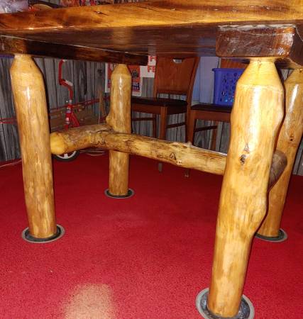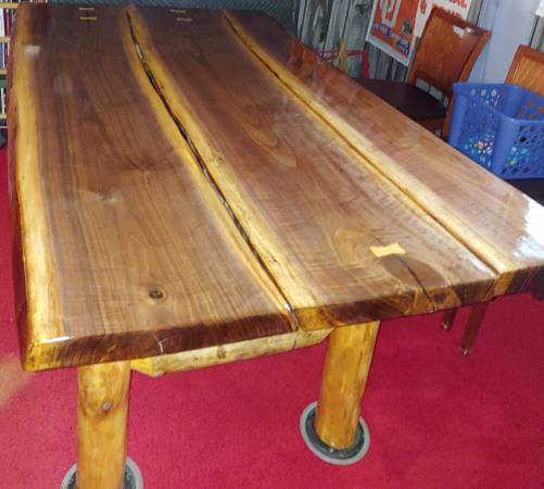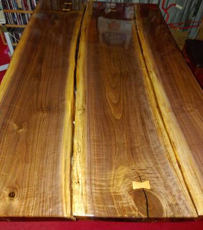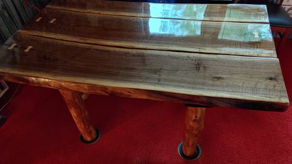 Walnut top w/ash legs & maple cross members. Bow ties w/black epoxy filled cracks. 5 coats of interior/exterior spar urethane finish. 62" L x 36" W x 31" H & 2" thick. Pick up only.