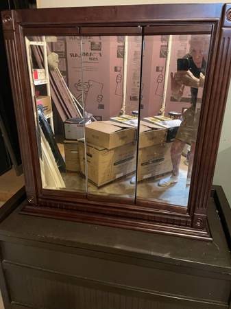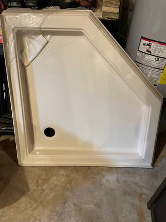 Complete bathroom new fixtures. Includes vanity with sink, mirror with shelves, toilet, ceramic floor tile (108+ sq. ft.), shower pan, sink and shower faucets,ceiling light. All new.