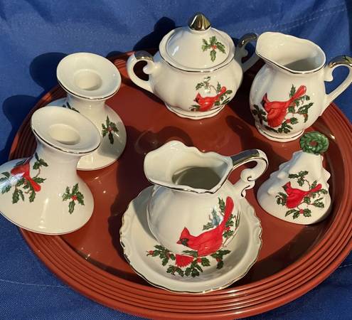 LEFTON hand painted china white with cardinal and holly 7 pieces candleholders, cream/sugar, bell, pitcher/plate