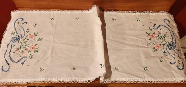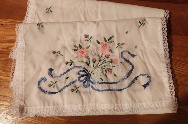 Vintage hand-embroidered cotton dresser scarves (2). Edged in lace. Each measures 36" long and 14" wide. My mother embroidered these in the 1940s or 1950s. $15 for both.
