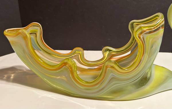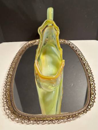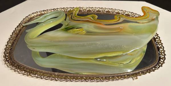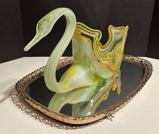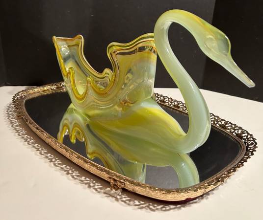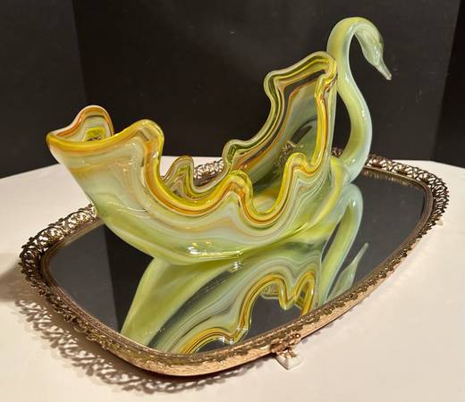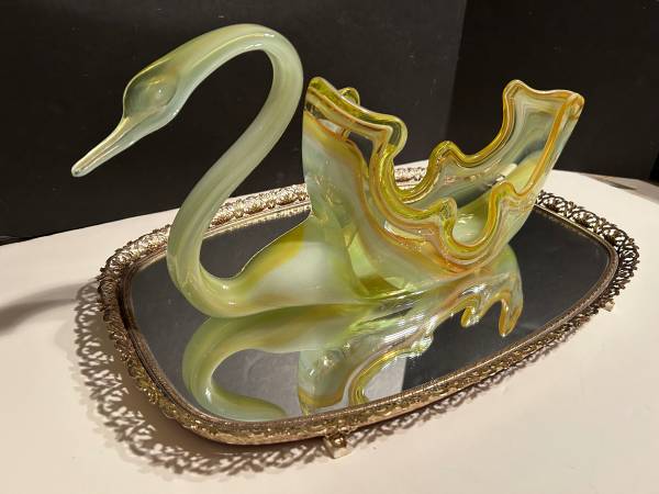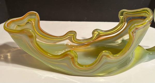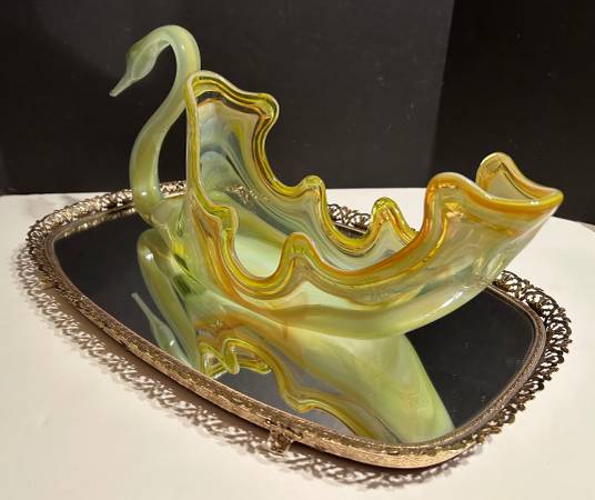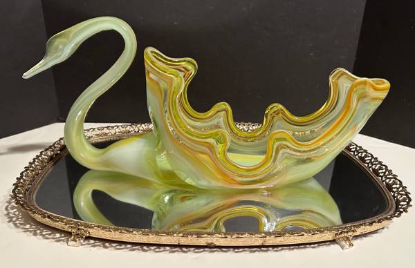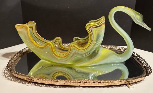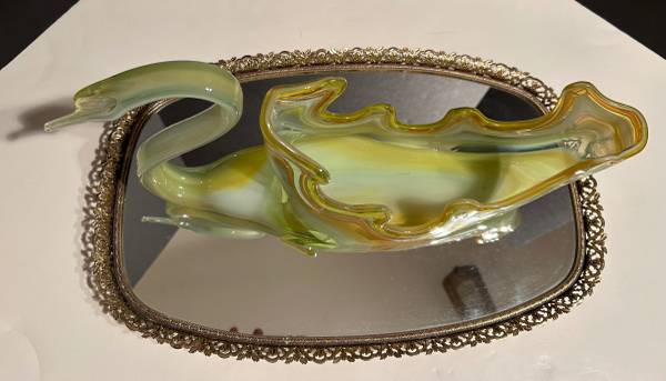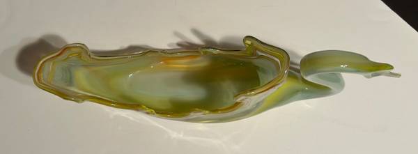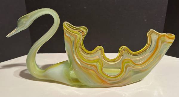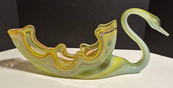 Selling a vintage Sooner glass swan bowl centerpiece. It is made with yellowish, greenish and orangish tones through clear glass. This beautiful piece is in good condition. Measures 16.25 inches...