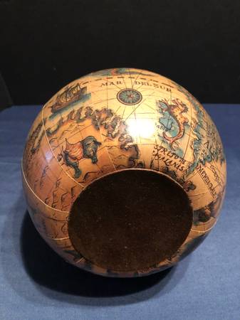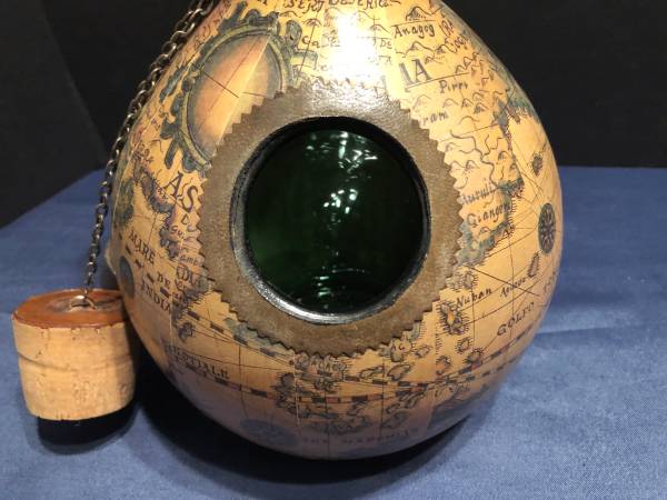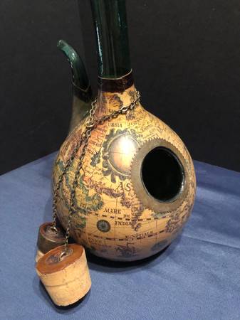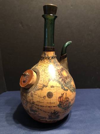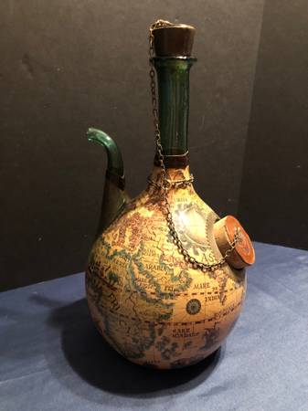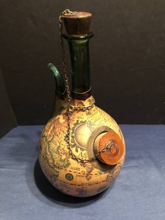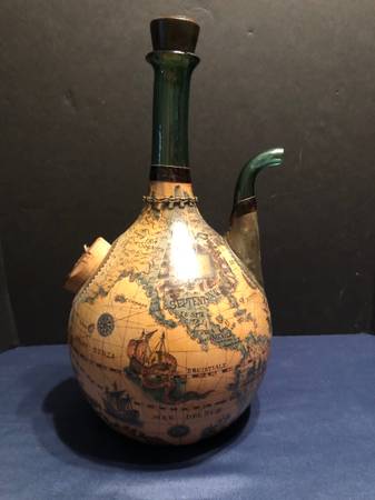 Selling a vintage green glass wine decanter. Has a spout and ice pocket with stoppers on top and at ice hole. Covered in a leather old world map. Good condition. Measures 15 inches tall by 8 inches diameter by 9 inches wide to spout. Ice hole cork is 2.25 inches wide and 1.75 inches wide top cork.