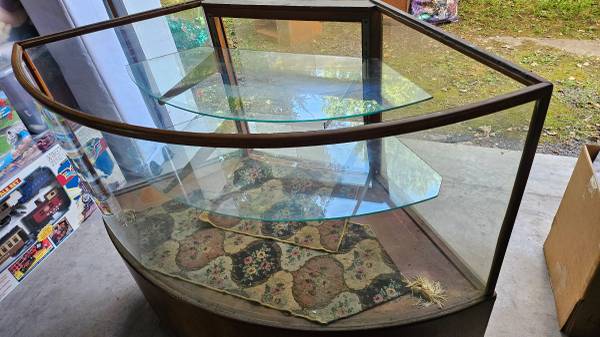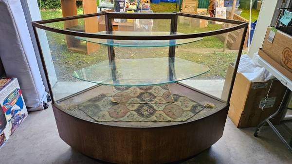 Rounded glass & wood display with two glass shelves. 40"tall-25"wide-50" long