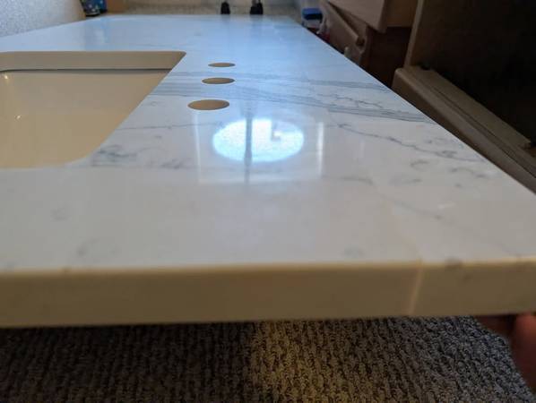 62 1/2 in. bathroom counter, quality and coloration must be seen to be appreciated. Solid 1 1/8" thick stone counter with matching 3 1/4 in. backsplash. Sink is 3 3/4 in. from right end. Both ends finished. 23 by 62 1/2 in. total size of countertop.
