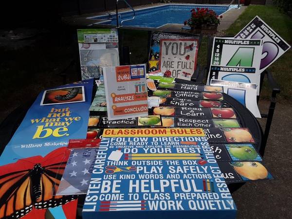 Retired teacher selling her abundant lot of colorful, seasonal elementary classroom decorations, posters and educational supplies. Many items are brand new in sealed packages; other items are gently used and are in like-new condition. All items are being sold from a smoke-free home.