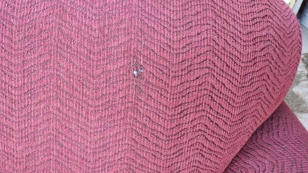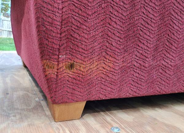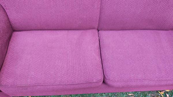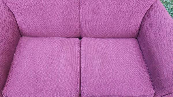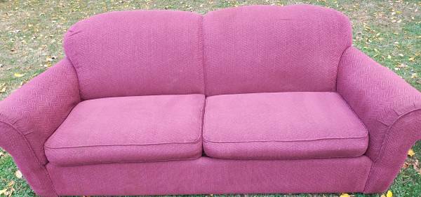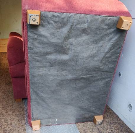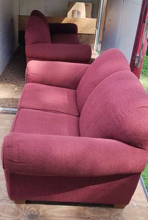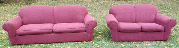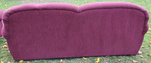 Very nice maroon (wine) sofa and loveseat combo set. I can't find a manufacturer's tag anywhere with name on it, but I got it from my aunt a few years back and she only bought very nice, expensive stuff. This is the kind of furniture I could never afford brand new. Both in excellent condition, loveseat has a spot of heat damage on the back near the bottom from sitting too close to a baseboard heater, and it has one small misc hole in the front that I don't recall being there, may have happened in storage (both are pictured). Gave them both a quick clean and thorough check and I can find no other problems anywhere, top or bottom. No rips or tears anywhere. Have been stored dry and secure from rodents for a few years. Tons of life left in this set. Perfect for a first apartment or college dorm. Nice quality furniture that will last.