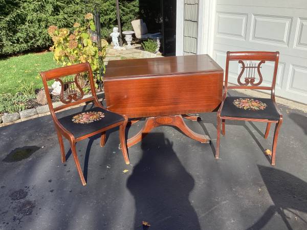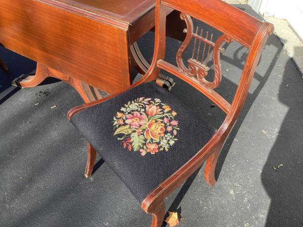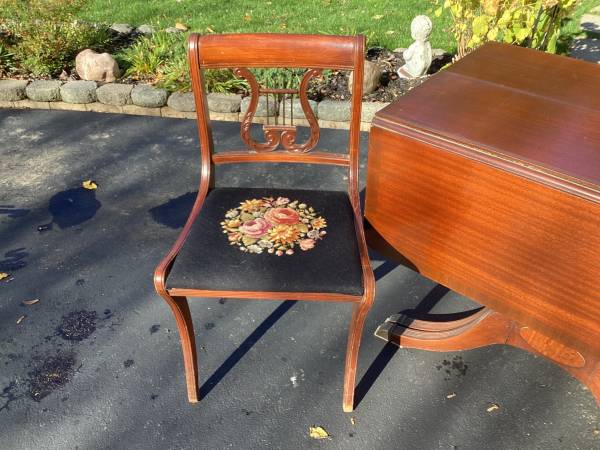 Mahogany drop leaf table with claw feet, 4 leaves and 6 harp back type chairs. Includes table top pads. Chairs will need a little TLC. The chair covers were handmade needlepoint covers and are in perfect condition. The table is 11 feet long total with leaves (7 feet without the leaves) and 3.5 feet wide. This table is over 100 years old.