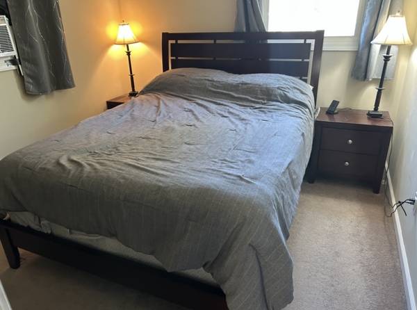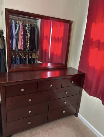 Queen dark cherry bedroom set. Headboard, footboard, rails, 2 nightstands, and 9 drawer dresser with mirror. $750.00